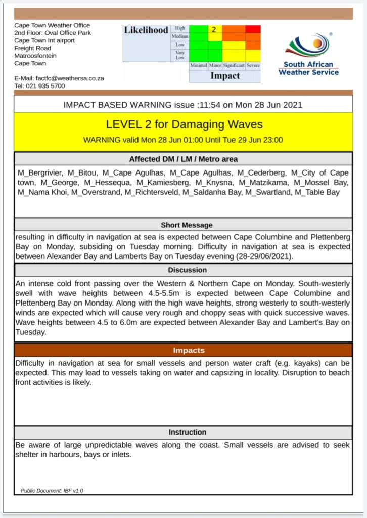 28 June 2021 Weather Alert: Impact Based Weather Warning: Damaging Waves