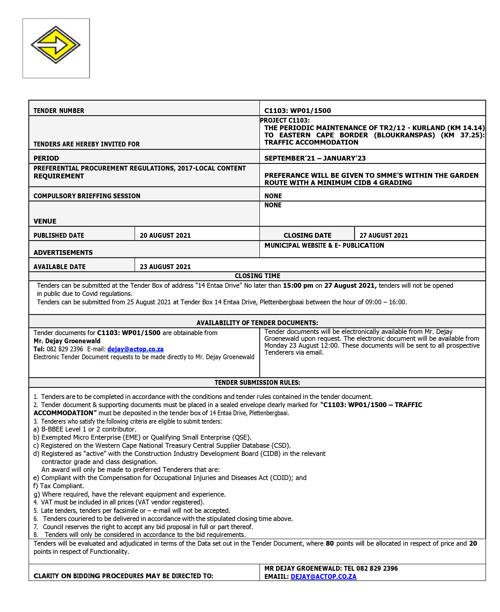 20 August 2021 THE PERIODIC MAINTENANCE OF TR2/12 – KURLAND (KM 14.14) TO EASTERN CAPE BORDER (BLOUKRANSPAS) (KM 37.25): TRAFFIC ACCOMMODATION Home / News /