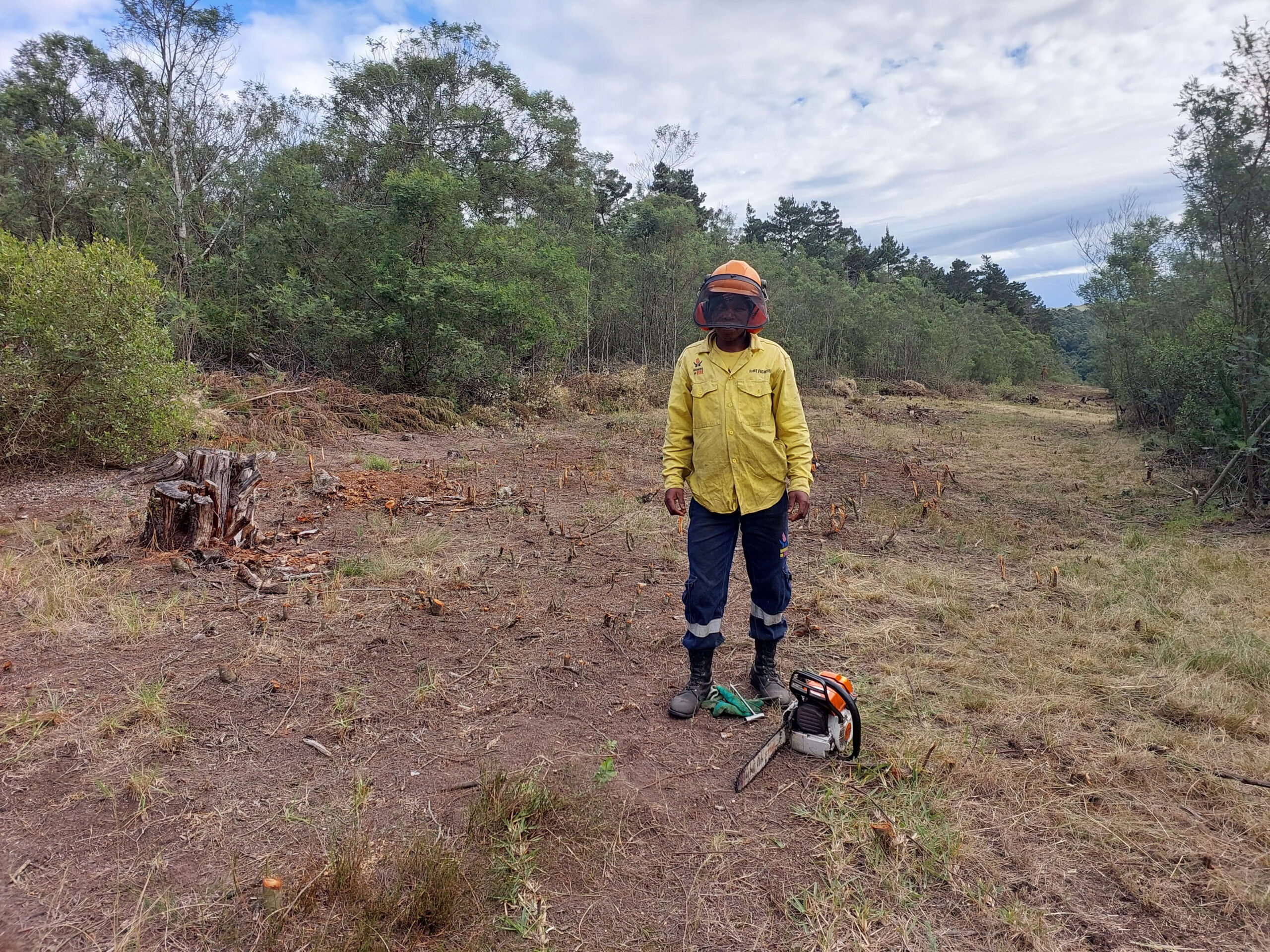 Feature image: Xola Melaphi from working on fire was part of the team who used various equipment to create a fire break – including chainsaws, brush cutters, hand-held slashers and rakes.