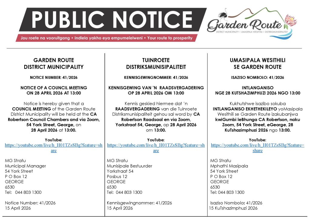 Notice is hereby given that a COUNCIL MEETING of the Garden Route District Municipality will be held at the CA Robertson Council Chambers and via Zoom, 54 York Street, George, on 28 April 2026 at 13:00.