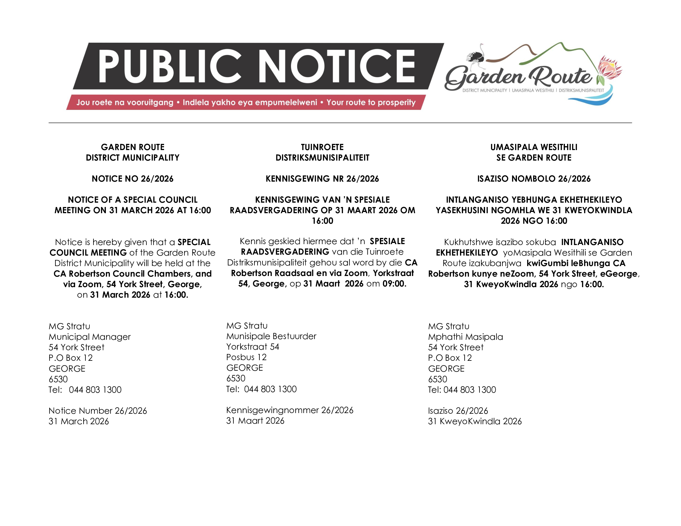 Notice is hereby given that all the offices of the Garden Route District Municipality will be closed on Thursday 2 April at 12:00 and re-open on Tuesday, 7 April 2026 at 07:30.