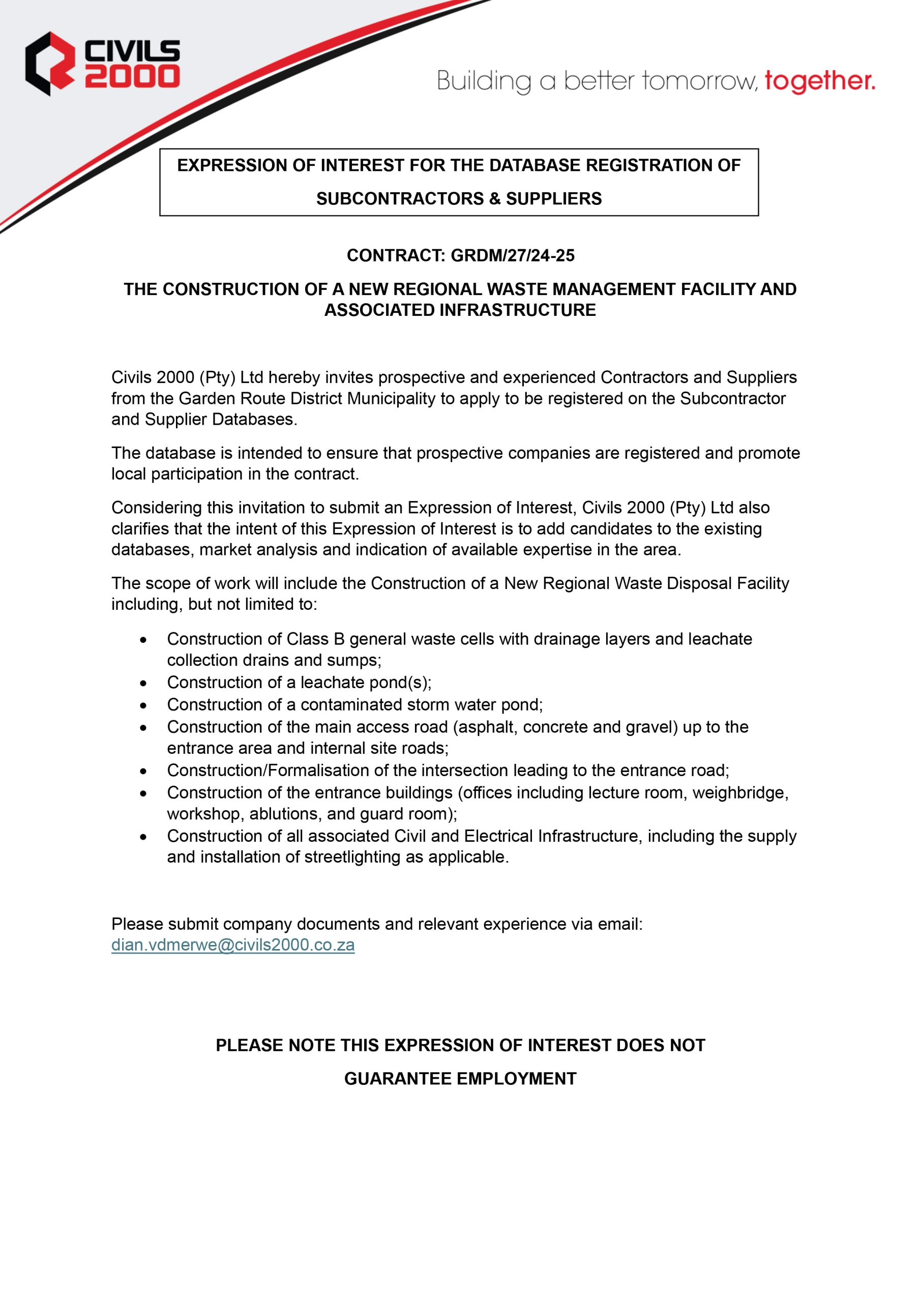Civils 2000 (Pty) Ltd hereby invites prospective and experienced Contractors and Suppliers from the Garden Route District Municipality to apply to be registered on the Subcontractor and Supplier Databases.