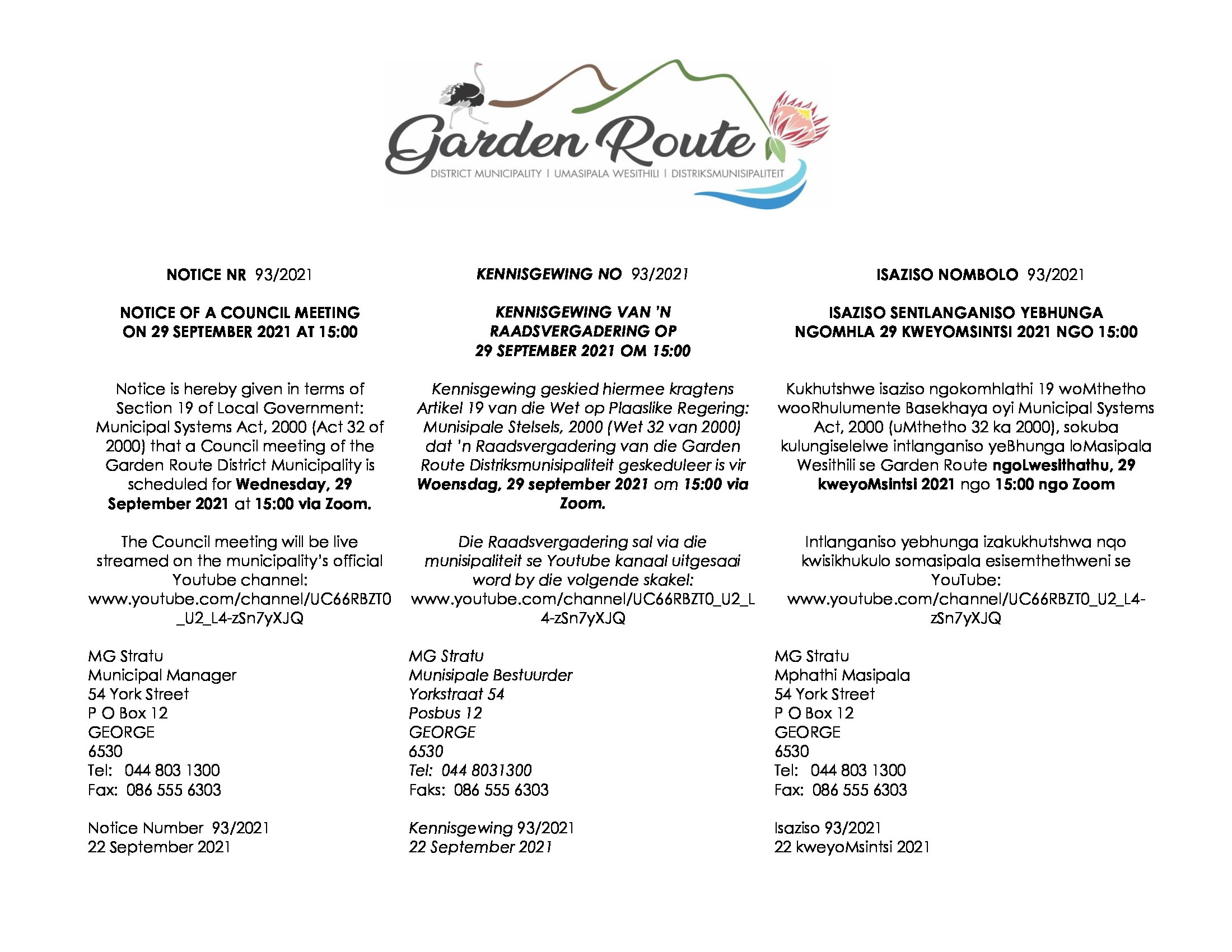 I want to say, especially to the municipality and the people of Oudtshoorn and Kannaland. To those mayors in absentia – you are not an island in this district. If one looks at what happened during the elections, sometimes it is human nature; we tend to stick to the colours of our t-shirts – blue, red, green, yellow and black. This is not how we do it here. We forget about our political parties. This is why I am zooming into Oudtshoorn and Kannaland – there is not going to be a mentality that we, as Garden Route, or me as the Mayor, will only deal with my “blue friends”.