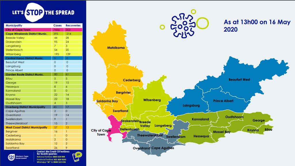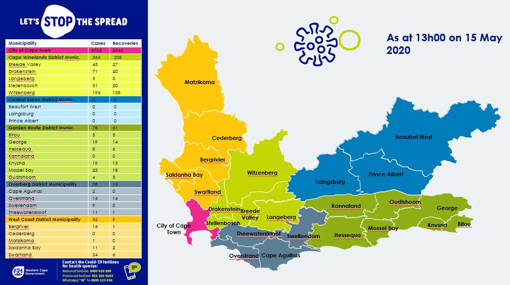 As of 1pm on 19 May, the Western Cape has 6195 active cases, 10558 total confirmed cases of Covid-19 infection and 4363 recoveries.