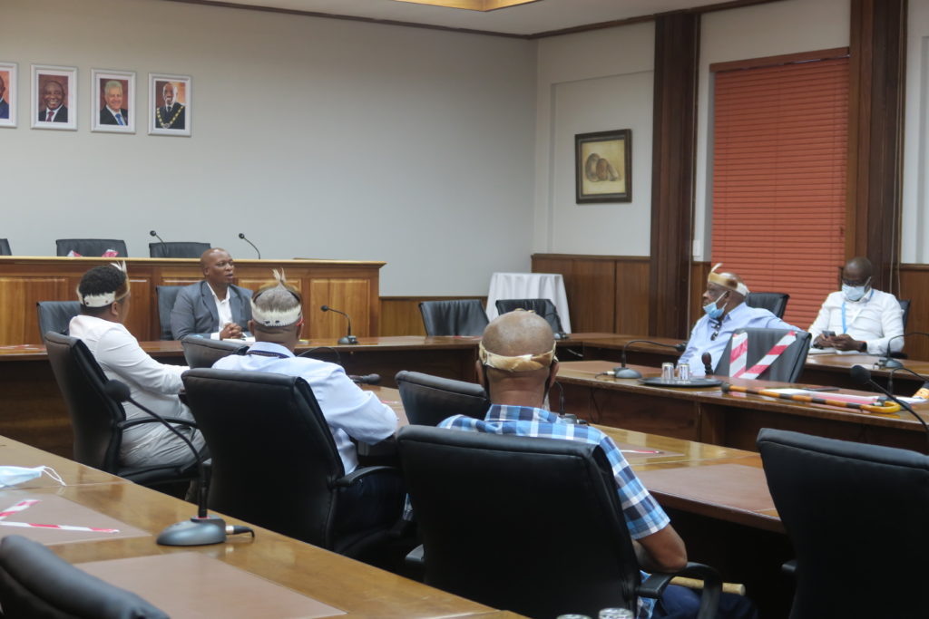 Mr Monde Stratu, Municipal Manager of GRDM, chaired the meeting, accompanied by the Executive Manager for Planning and Economic Development at GRDM, Mr Lusanda Menze, and other officials. Senior Chief from Gona – Hess !Kwe Royal Kingdom, Mr Lionel Prins, was accompanied by Headman Jeemon Adams, Chief John Nankoe, Assisting Senior Chief Neville Olyn, Chief Dullin Appels, Senior Chief William Sukers, Paramount Chief Vernon Andries, Senior Paramount Chief and King Cornelius Botha fifth.