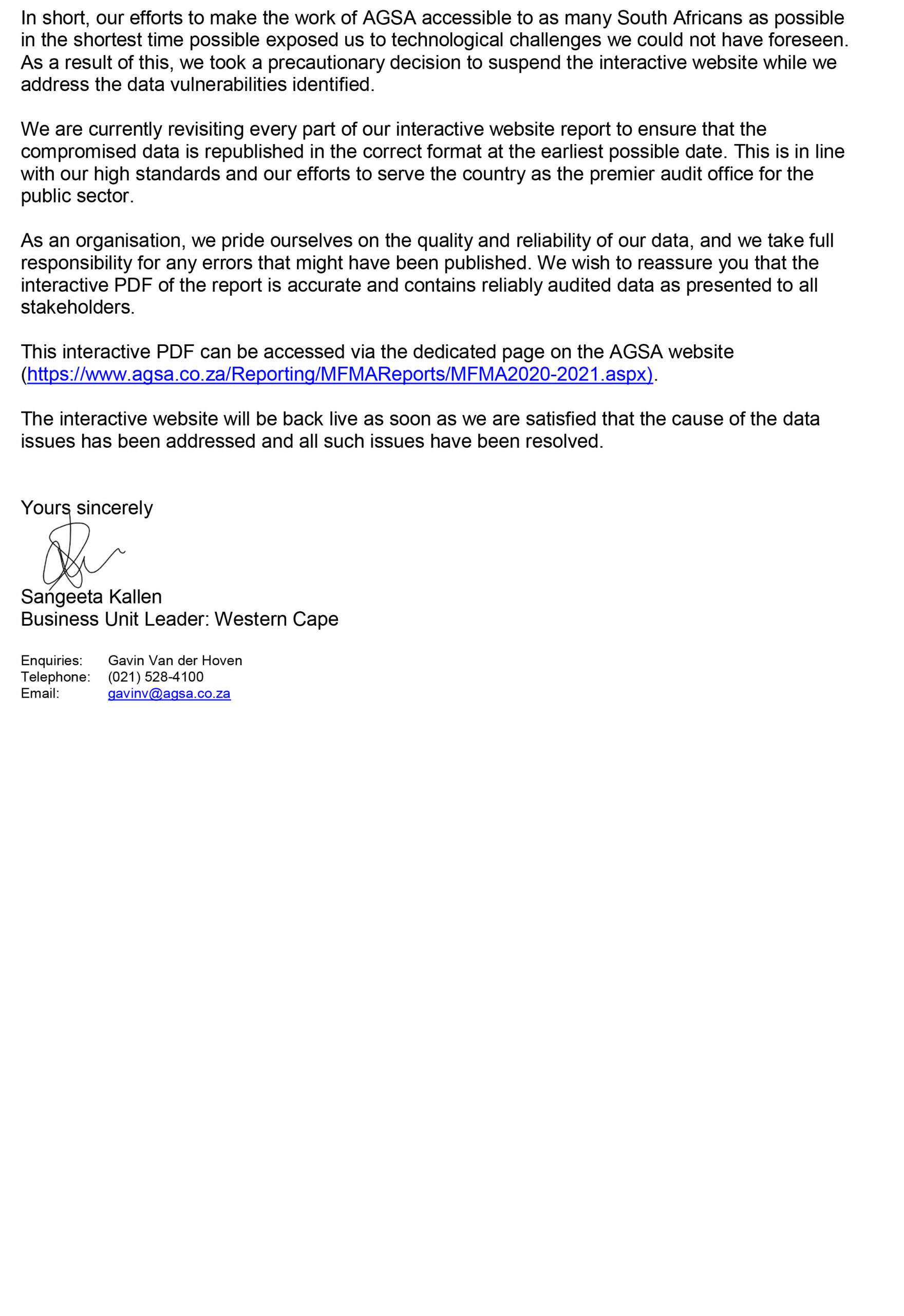 The Auditor General of South Africa (AGSA) recently directed a letter to Garden Route District Municipality (GRDM) Municipal Manager, Monde Stratu, to clarify the ambiguous reporting done on 15 June 2022 during a media briefing session. The AG, during the session, tabled a report outlining the 2020/21 Municipal Finance Management Act (MFMA) audit outcomes of local government.