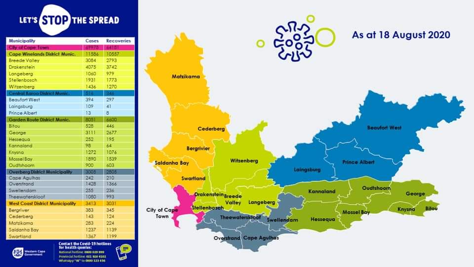 As of 1pm on 24 August, the Western Cape has 5084 active cases of COVID-19, with a total of 102 615 confirmed cases and 93 788 recoveries.