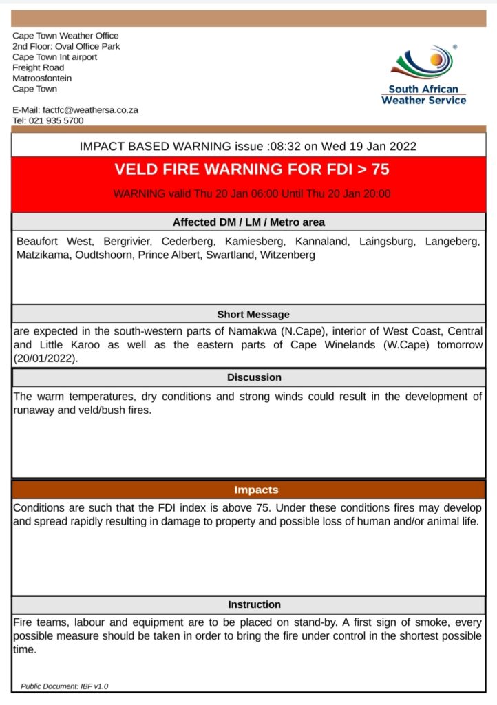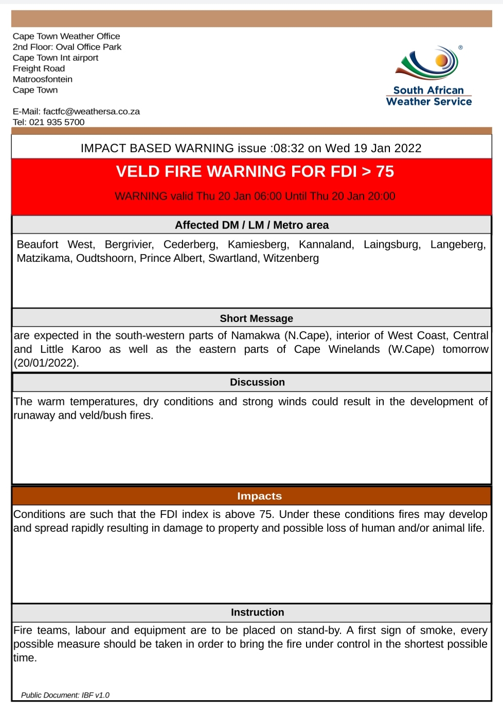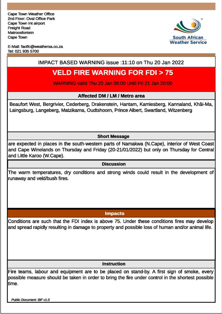 Please find included the Impact Based Warning for the Western Cape and Namaqua Region of Northern Cape.